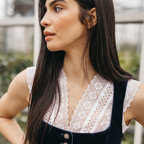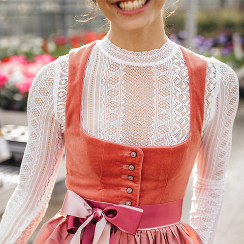 Dass wir unter dem Dirndl eine Bluse tragen, hat mit Blick auf die Entstehung der Trachtenmode einen eher praktischen Grund: Damit die Mägde, deren Dienstbekleidung das Dirndl früher war, ihr Kleid so lange wie möglich tragen konnten, ohne es ständig waschen zu müssen, trugen sie unter dem Dirndl eine Bluse, die gewechselt werden konnte. Natürlich funktioniert dieser Trick heutzutage auch noch, doch inzwischen tragen wir wohl eher aus optischen Gründen verschiedene Dirndlblusen – denn unterschiedliche Blusen können ein und demselben Dirndl eine komplett andere Ausstrahlung verleihen und den Look verändern. Zu den verschiedenen Ausschnitten des Dirndls gibt es die jeweils passenden Blusen, die klassische Farbe ist Weiß, die tatsächlich mit allen Dirndl-Modellen harmoniert. Zu sehr dunklen und besonders eleganten Stoffen wie Samt wird ab und an auch gerne extravagantes Schwarz kombiniert.
