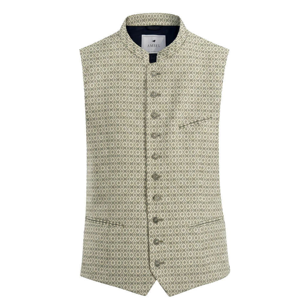 Die Trachtenweste in Grün mit feinem Muster ist eine elegante Wahl für Frühling, Hochzeit oder festliche Trachtenanlässe. Das stilvolle Muster aus Weiß und Grün verleiht der Weste eine besondere Leichtigkeit und macht sie zu einem echten Blickfang. Der klassische Stehkragen sowie die hochwertigen Münzknöpfe unterstreichen den traditionellen Charakter und sorgen gleichzeitig für einen modernen, gepflegten Auftritt.