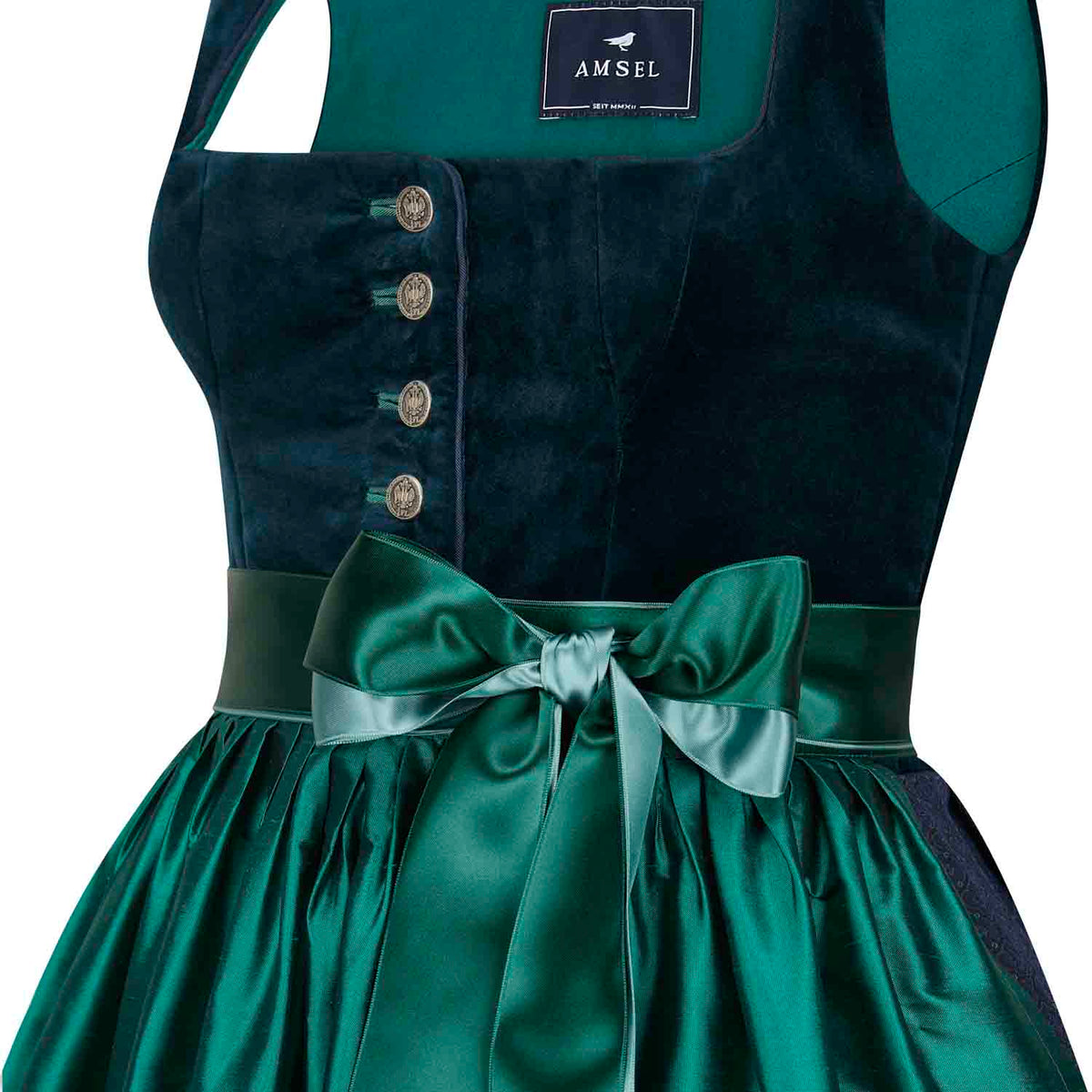 Der in Falten gelegte Rock mit feinem Muster fällt schön und endet auf Midilänge. Abgerundet wird das Design durch die elegante Seidenschürze in Petrol mit doppellagigem Satinband – ideal für Hochzeiten, das Oktoberfest oder stilvolle Festtage.