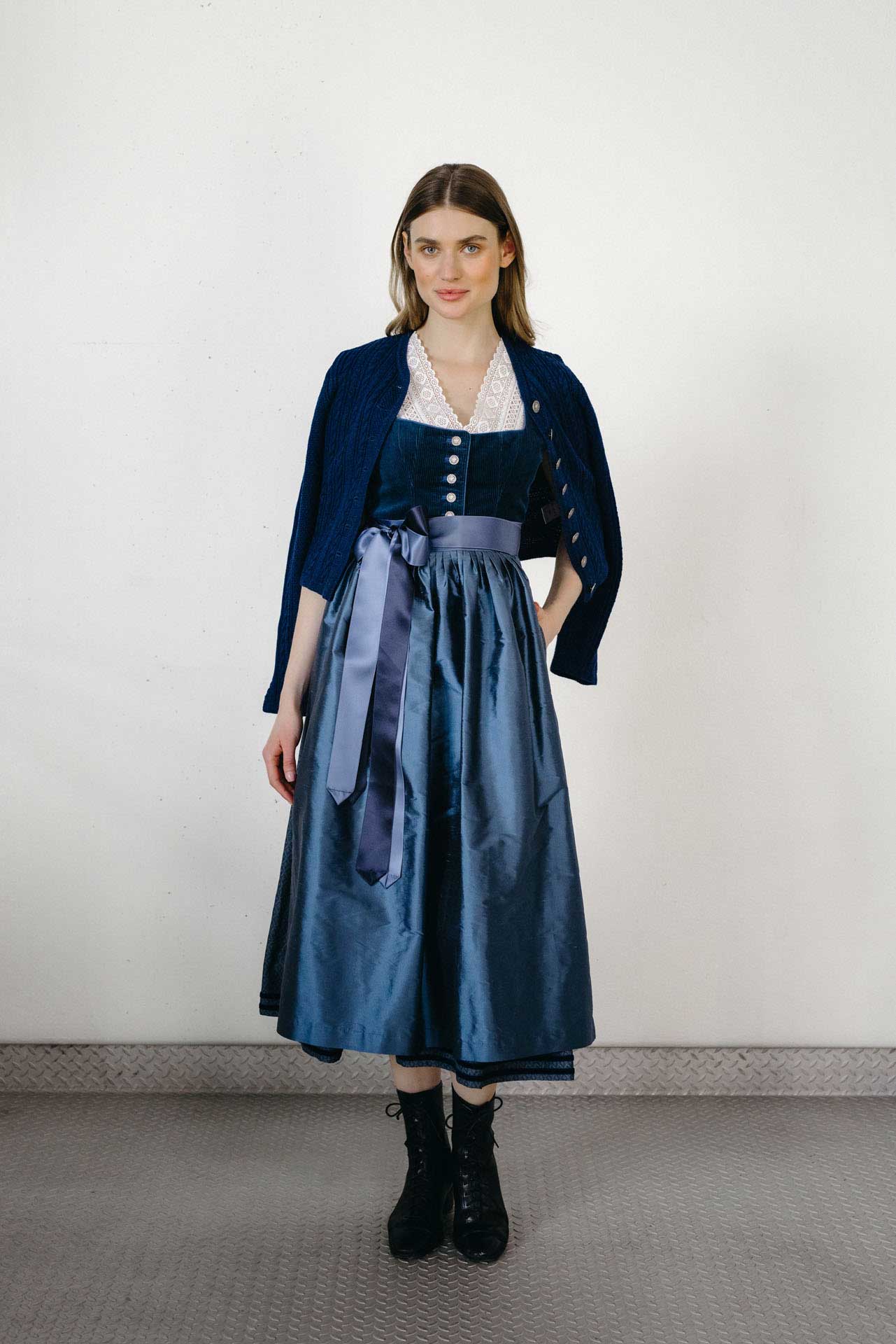 Der lange Rock (83cm) fällt schön und unterstreicht die fließende Wirkung des Cordstoffs. In Kombination mit der blaufarbenen Seidenschürze entsteht ein stimmiges Gesamtbild – ideal für herbstliche Feste, elegante Trachtenevents oder stilvolle Wiesn-Besuche.