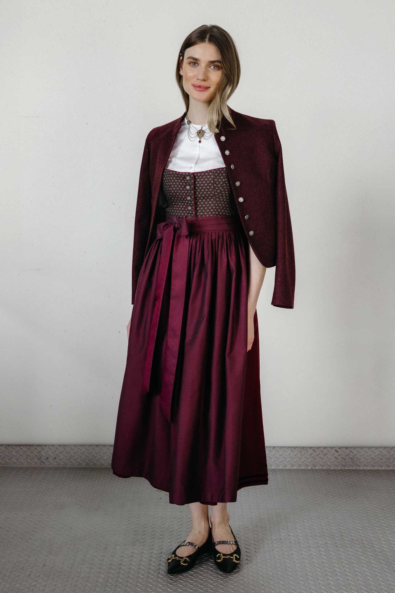 Dirndl Alexandra in tiefem Rot wirkt gleichzeitig kraftvoll und klassisch. Das strukturierte Mieder mit Münzknöpfen verleiht dem Dirndl eine traditionsbewusste Optik, während der lange Rock weich fällt und elegant schwingt.