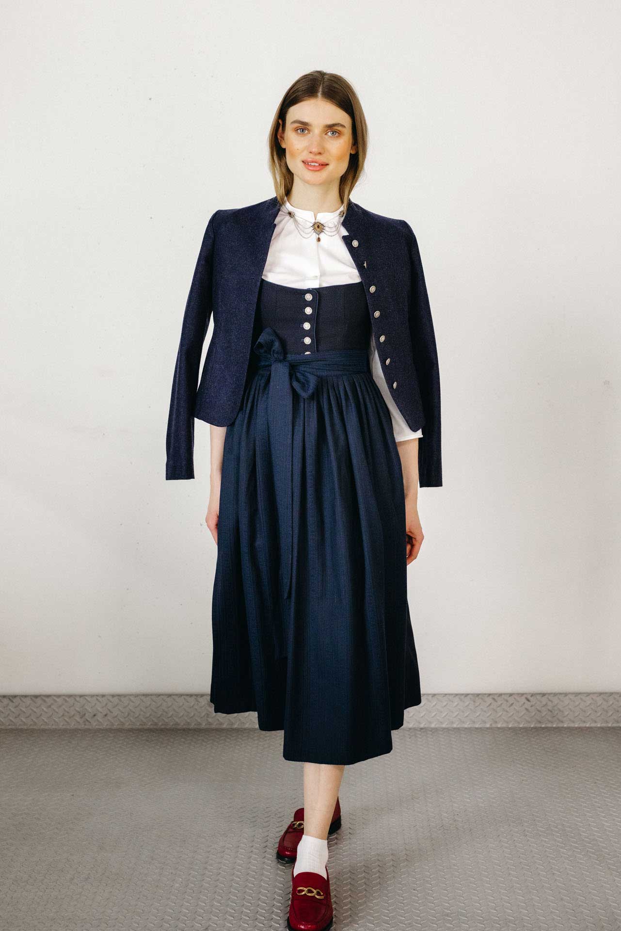 Dirndl Klara besticht durch seine klare Silhouette und das tiefe Blau des fein strukturierten Mieders. Die elegante Knopfleiste mit traditionellen Metallknöpfen verleiht dem Design einen klassischen Charakter.