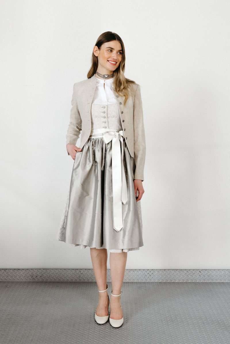 Ein besonderes Detail ist die champagnerfarbene Schürze aus glänzender Dupionseide, die das Dirndl stilvoll abrundet. Mit einer Rocklänge von 73 cm gehört das Modell zu den Mididirndln – ideal für standesamtliche Trauungen, Trachtenhochzeiten oder andere festliche Anlässe mit besonderem Anspruch.