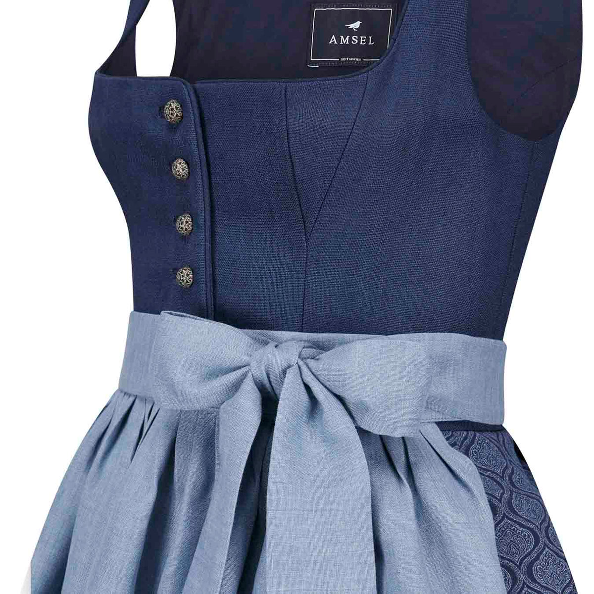 • Blaues Leinendirndl mit gemustertem Baumwollrock