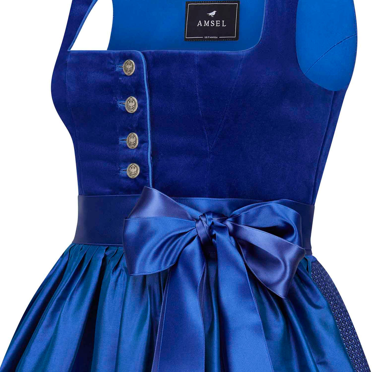 Die schimmernde Seidenschürze in passendem Königsblau mit glänzenden Satinbändern vollendet den edlen Look – ideal für Hochzeiten, Oktoberfest oder als stilvoller Auftritt bei besonderen Anlässen.