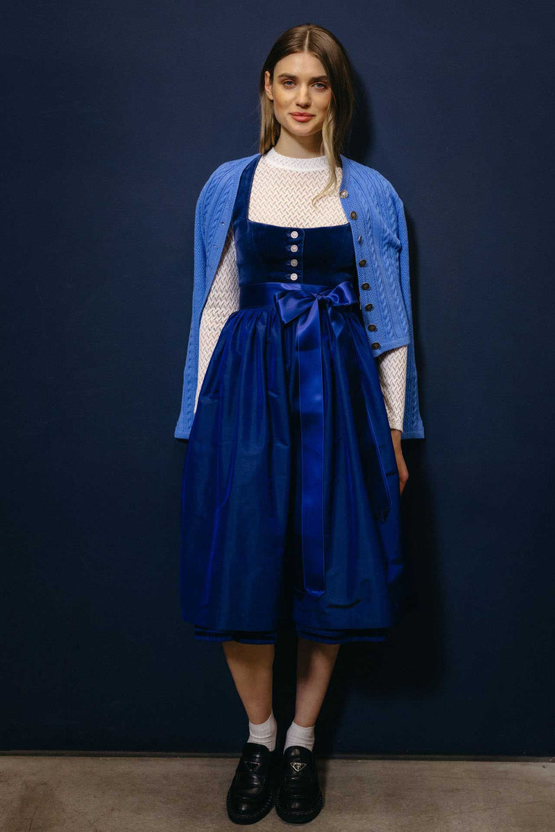 Samtdirndl Mara in Blau – elegantes Mididirndl mit Seidenschürze