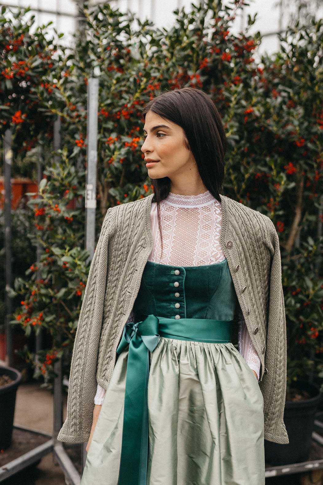 Das Dirndl Mara in Mint ist ein frischer, moderner Klassiker mit edlem Samtmieder und liebevollen Details. Der Baumwollsamt ist atmungsaktiv und angenehm zu tragen – kein bisschen warm – und durch den Stretchanteil besonders komfortabel.