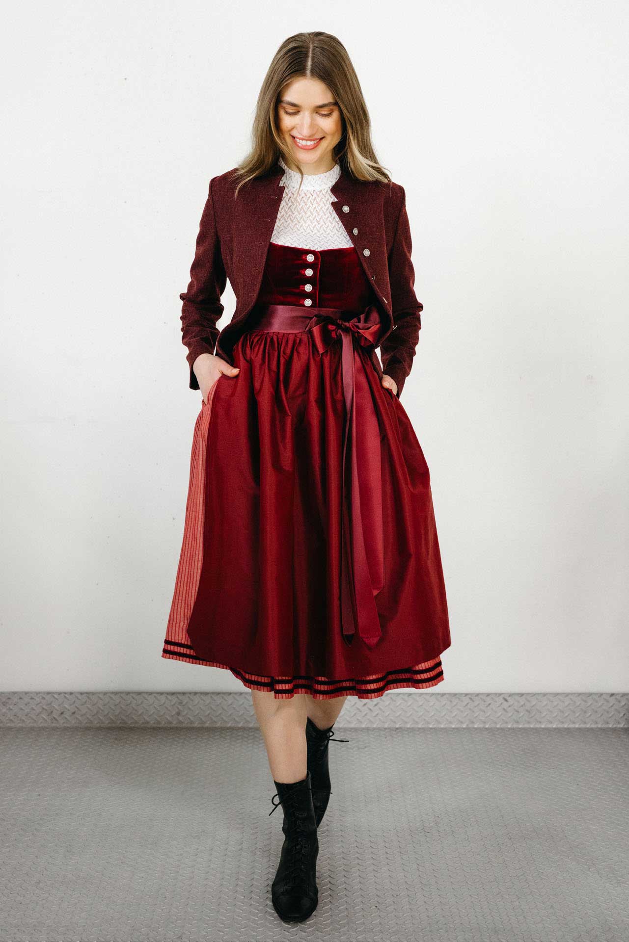 Das Mieder ist aus atmungsaktivem Samt mit Stretch-Anteil gefertigt und bietet dadurch einen besonders angenehmen Tragekomfort. Die klassische Knopfleiste mit Münzknöpfen verleiht dem Dirndl einen traditionellen Look, während die farblich abgestimmte Seidenschürze mit leichtem Glanz das Gesamtbild elegant abrundet. Mit einer Rocklänge von 73 cm zählt Ruby zu den Mididirndln – perfekt für alle, die Statement und Stil verbinden möchten.