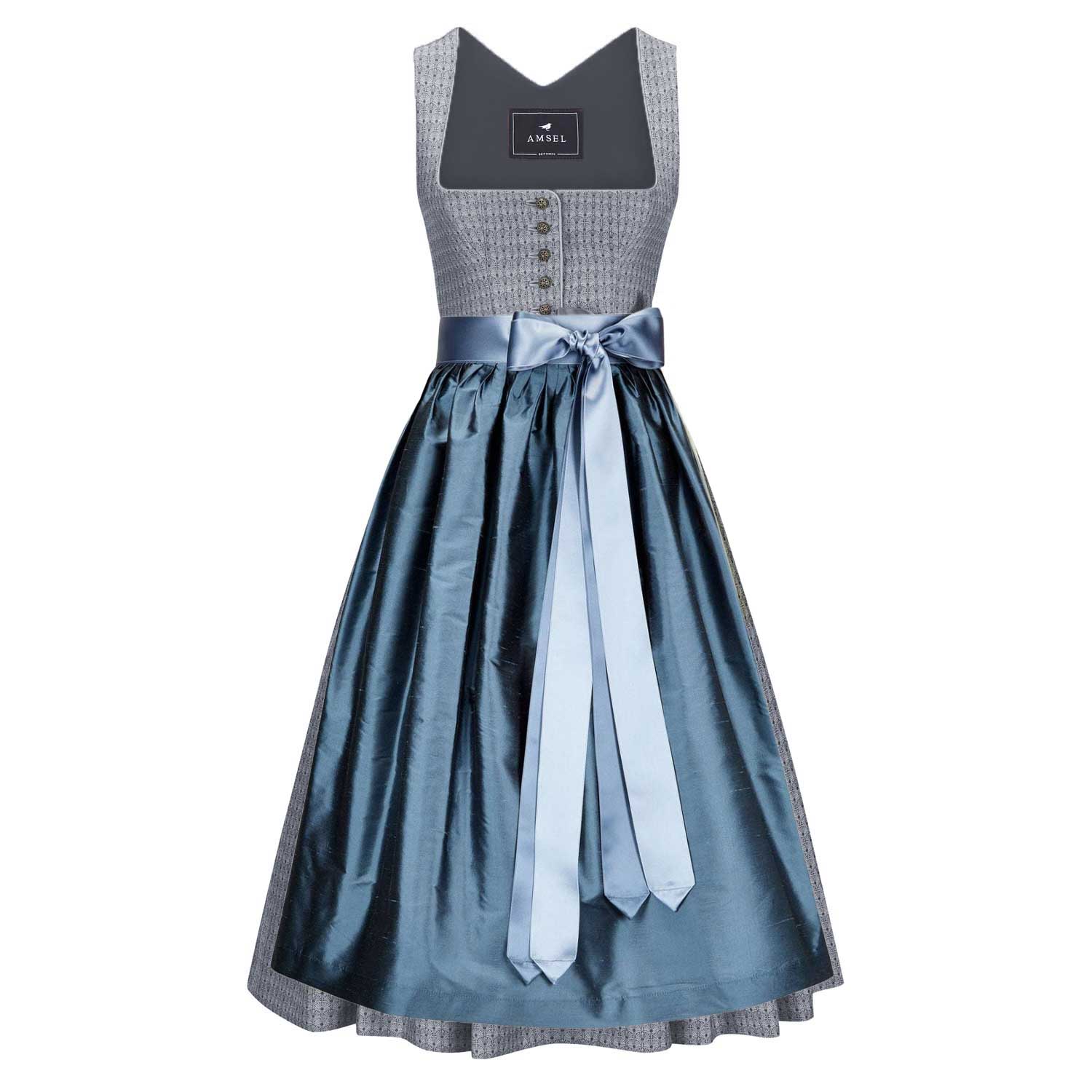 Der schön fallende Rock in tiefem Blau bringt durch seinen edlen Schimmer eine besondere Tiefe ins Gesamtbild. Die hochwertige Seidenschürze mit zweifarbigen Satinbändern setzt einen stilvollen Akzent und unterstreicht den charakteristischen Amsel-Look. Mit einer Rocklänge von 73 cm ist dieses Dirndl als Midi Dirndl vielseitig tragbar – elegant, modern und absolut zeitlos.